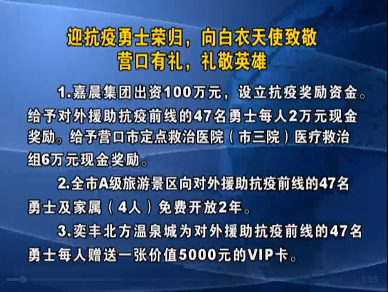 嘉晨集團以體現大企業(yè)的責任與擔當,出資100萬元,設立抗疫獎勵資金。給予對外援助抗疫前線的47名勇士每人2萬元現金獎勵;給予營口市定點救治醫(yī)院(市三院)醫(yī)療救治組6萬元現金獎勵。以此表達對抗疫英雄的崇高敬意和無限愛戴。
