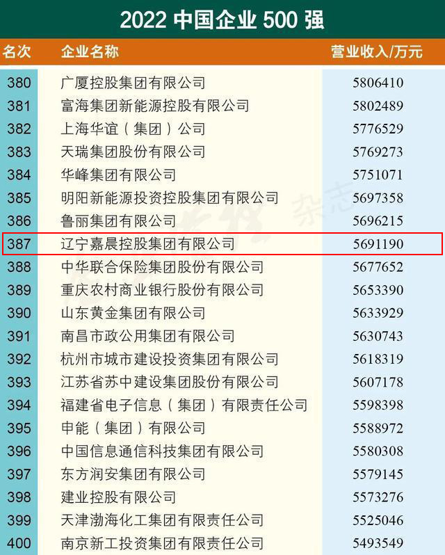 9月6日,中國企業(yè)聯(lián)合會(huì),中國企業(yè)家協(xié)會(huì)在京發(fā)布了“2022中國企業(yè)500強(qiáng)”榜單,遼寧嘉晨控股集團(tuán)榜單排名387位。今年是“中國企業(yè)500強(qiáng)”榜單自發(fā)布以來入圍門檻絕對(duì)值提高最多的一年。